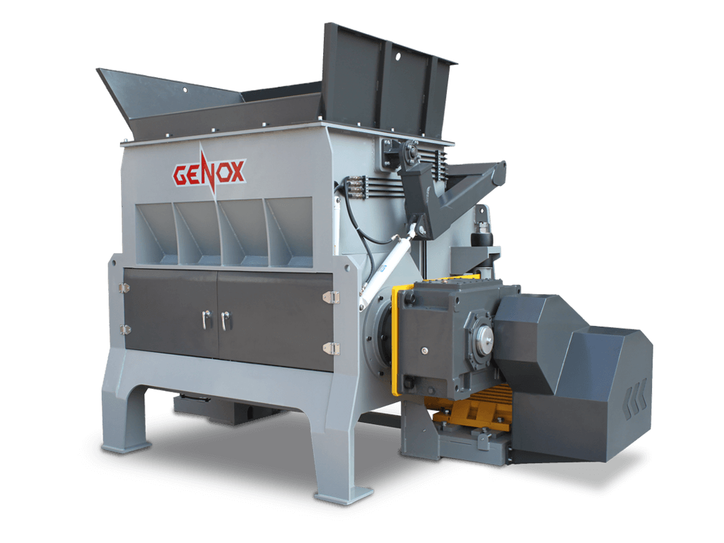 The K Series Single Shaft Shredders are heavy duty machines suitable for processing a wide range of materials. This range is ideal for the size reduction of flexible and/or medium hardness hollow products often loaded in bales. The fast acting, PLC controlled swing pusher automatically forces material to the rotor according to motor loading, maximizing material throughput. The K Series single shaft shredder is supplied and installed by Genox UK.